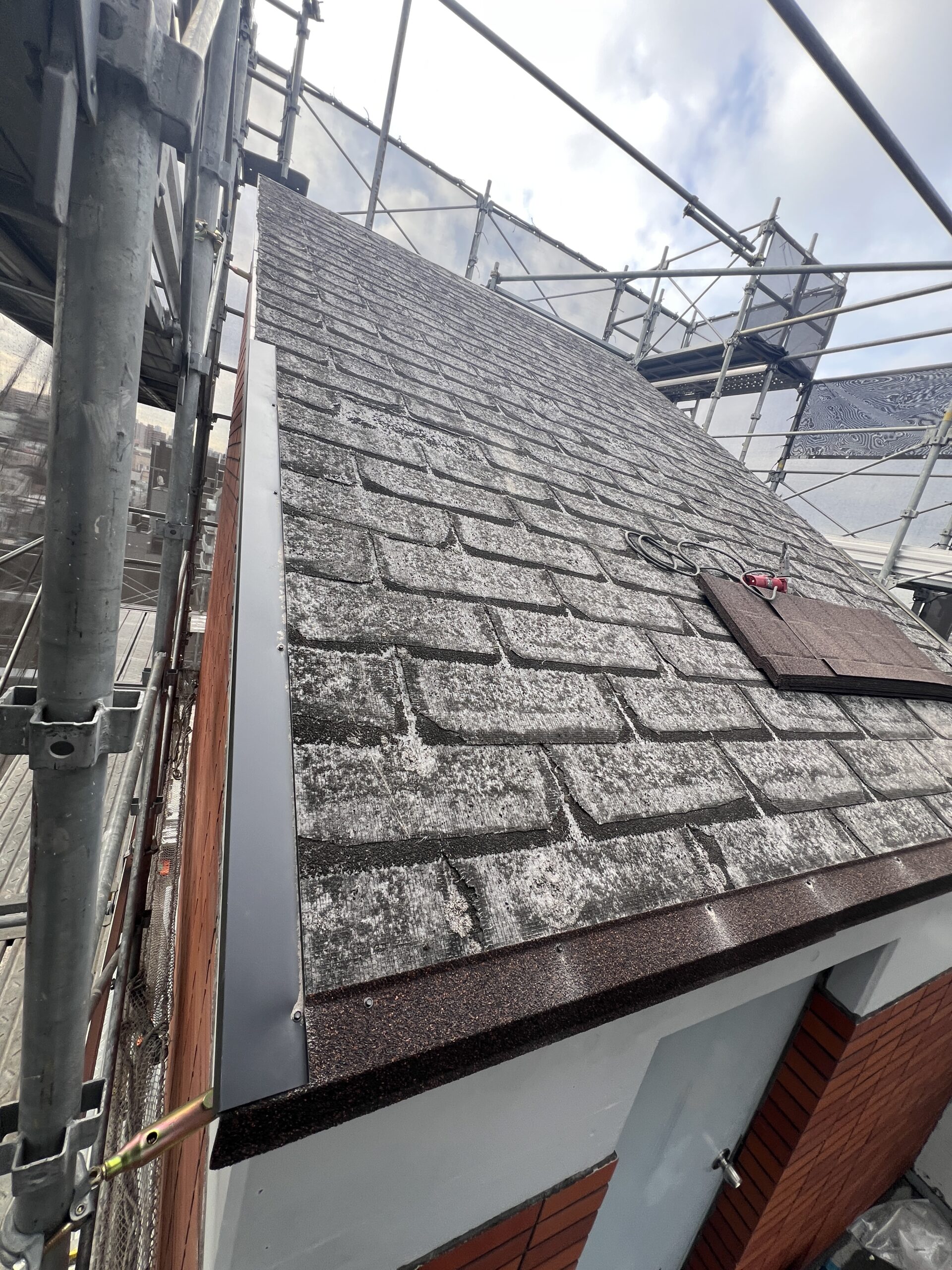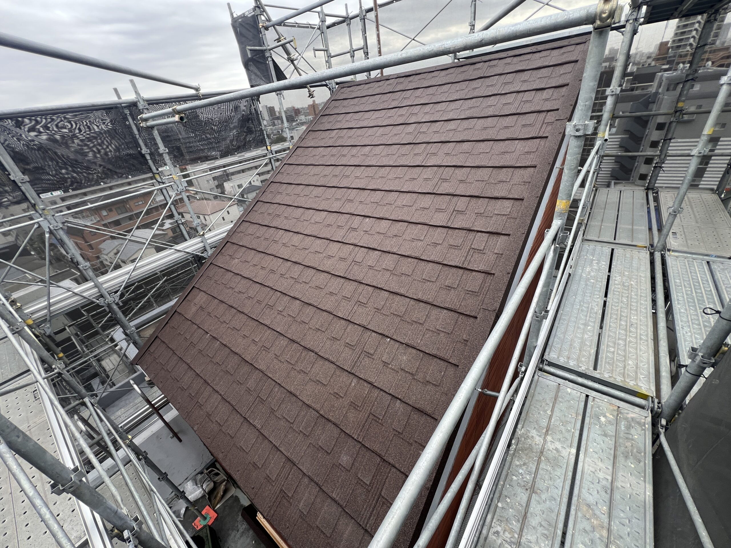 施工後は屋根全体の印象が落ち着いた仕上がりとなり、マンション外観とも調和した屋根となりました。