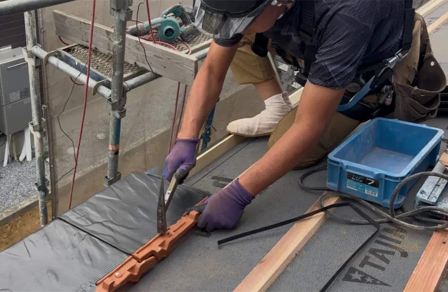 施工について 阪神・淡路大震災や東日本大震災等での瓦の落下や建物の倒壊を経て、2001年より新築時には『ガイドライン工法』が制定されました。釘やビスによる瓦の留め付け、銅線等による緊結の基準ができ、2022年の改定からは『すべての部位の瓦の緊結』が義務付けられています。